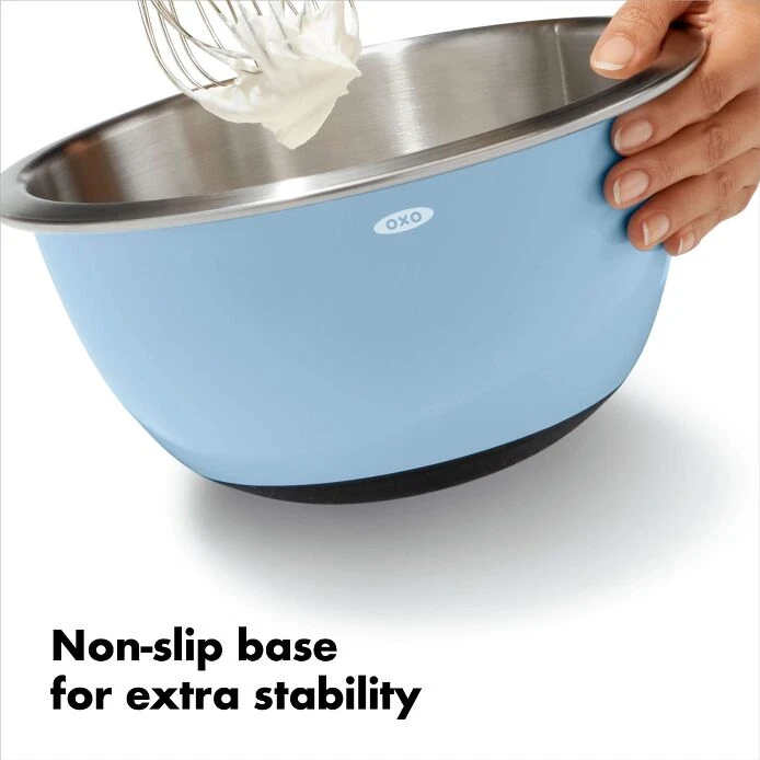 Our Stainless Steel Mixing Bowls feature brushed stainless steel interiors that take on the temperature of ingredients, plus white plastic exteriors that keep your hands at room temperature. The non-slip bases won’t slide while mixing and the dishwasher-safe bowls nest for simple storage. Set includes 1.5-quart, 3-quart and 5-quart Mixing Bowls.