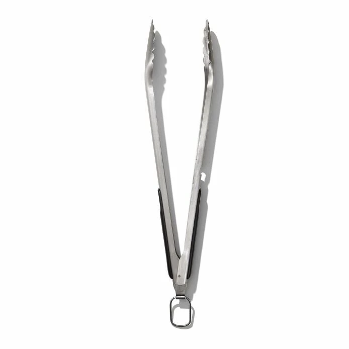 With heavy-duty stainless steel construction and a smart, scalloped head design, the OXO Good Grips Grilling Tongs with Built-In Bottle Opener are sure to be your grilling go-tos. Angled heads grab and hold onto everything from thick cuts of meat to corn on the cob for fumble-free flipping, turning, and transferring. The handle has a built-in bottle opener for ultimate convenience and an extra-long design to keep hands safely away from heat. Pull the ring to lock the Tongs closed and hang right by the grill for storage. Dishwasher safe.