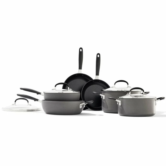 The OXO Good Grips Non-Stick 10-Piece Cookware Set is an essential collection of pots and pans that will complete your kitchen whether you’re upgrading your cookware or registering for your first set. All pieces in the Set feature a three-layer, German-engineered non-stick coating that provides effortless performance while using less oil and makes cleanup quick and easy. The scratch-resistant, hard-anodized bodies heat faster and more evenly than traditional aluminum, and the silicone-wrapped stainless steel handles help keep cooking comfortable. The thoughtfully designed bodies create the ideal angle for efficient stirring, and durable glass lids make it easy to check on your progress without losing heat. Dishwasher safe. Oven safe up to 390°F/200°C. Set includes: 8-in/20 cm and 9.5-in/24 cm Frying Pans, 2 Qt/1.9 L Saucepan with Lid, 3 Qt/2.8 L Sauté Pan with Lid, 3 Qt/2.8 L and 6 Qt/5.7 L Stock Pots with Lids. 10-year limited warranty.