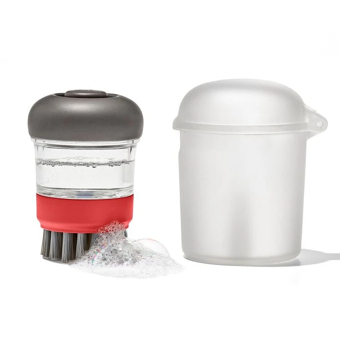 Whether it’s a campsite cookout, frying up fresh caught fish, the OXO Outdoor Soap Dispensing Brush with Storage Case can tackle any mess left behind. The palm-sized Brush has durable nylon bristles that are safe to use even on non-stick cookware, while the easy-press button dispenses just the right amount of soap each and every time. The convenient storage case includes an inner post to keep brush valve from dispensing soap while in storage. The case snaps shut to prevent it from accidentally opening. Replacement brush heads available. Dishwasher safe.