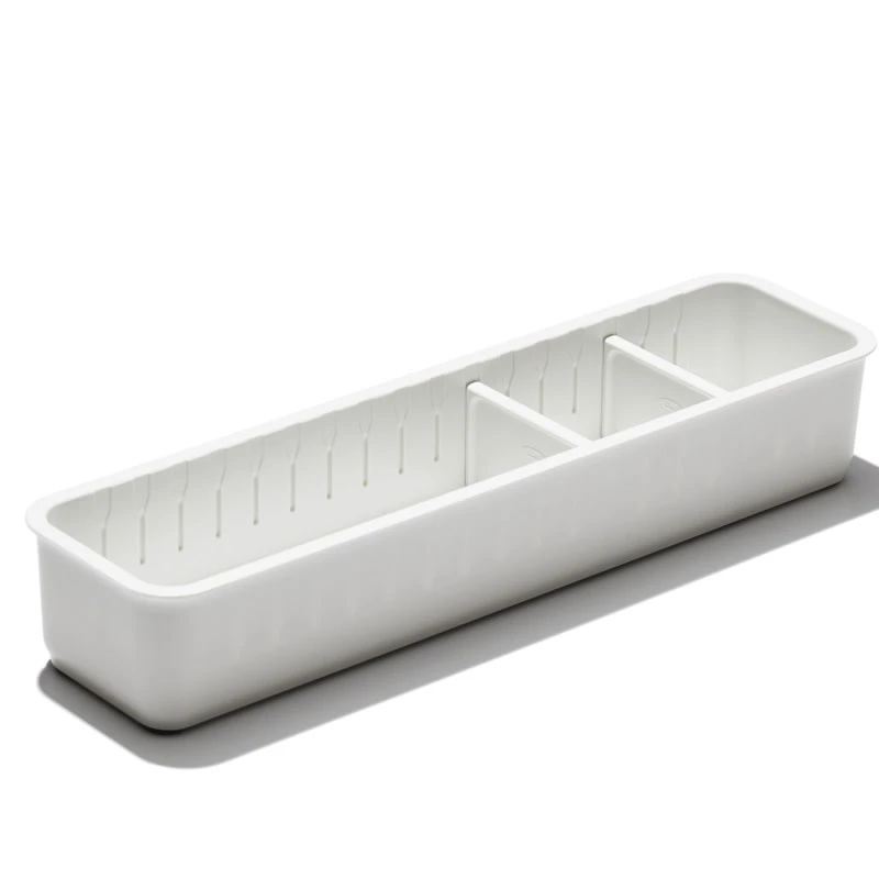 Adjustable Drawer Bin, with 2 moveable dividers, 30.5 x 8 x 5cm H, BPA free. Perfect for all drawer organization in the kitchen, bathroom, office and more.