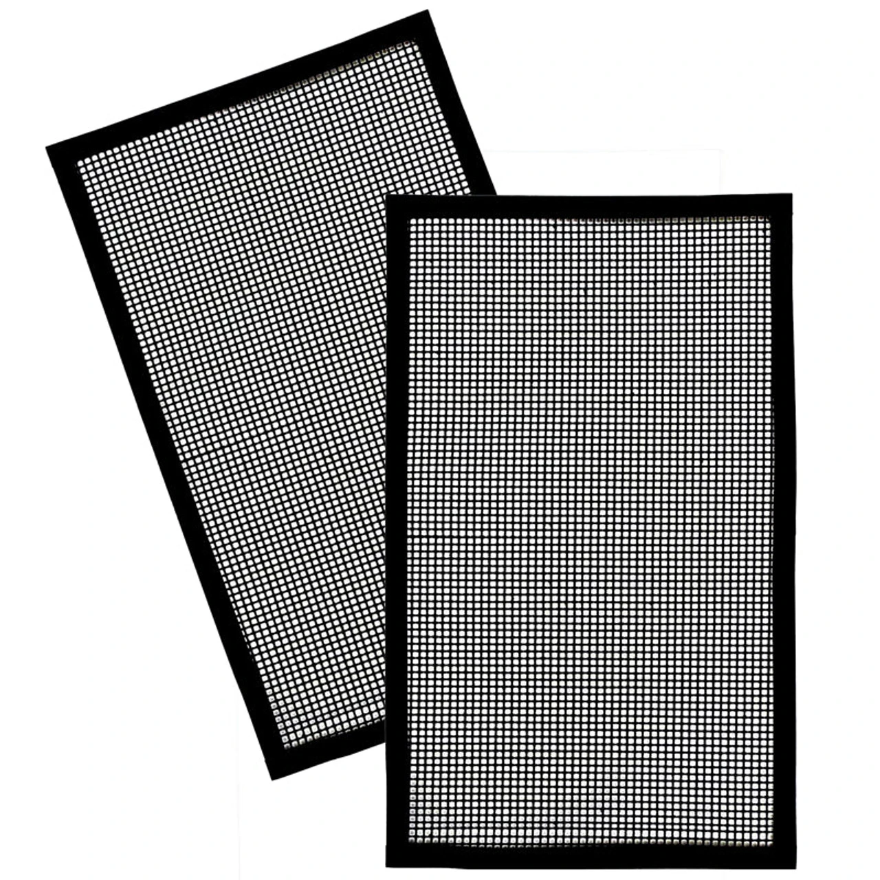 Mesh Grill Mats, set of 2, 47.5 x 29cm, non-stick and reusable. Suitable for grilling meat, poultry, fish, vegetables and more. Meshed to prevent small pieces of food from slipping through the grill. Suitable for gas, charcoal, propane, electric barbecues. Heat resistant to 204C (400F). Made from premium high temperature resistant PTFE coated fiberglass. Contains no PFOA, or other harmful chemicals.