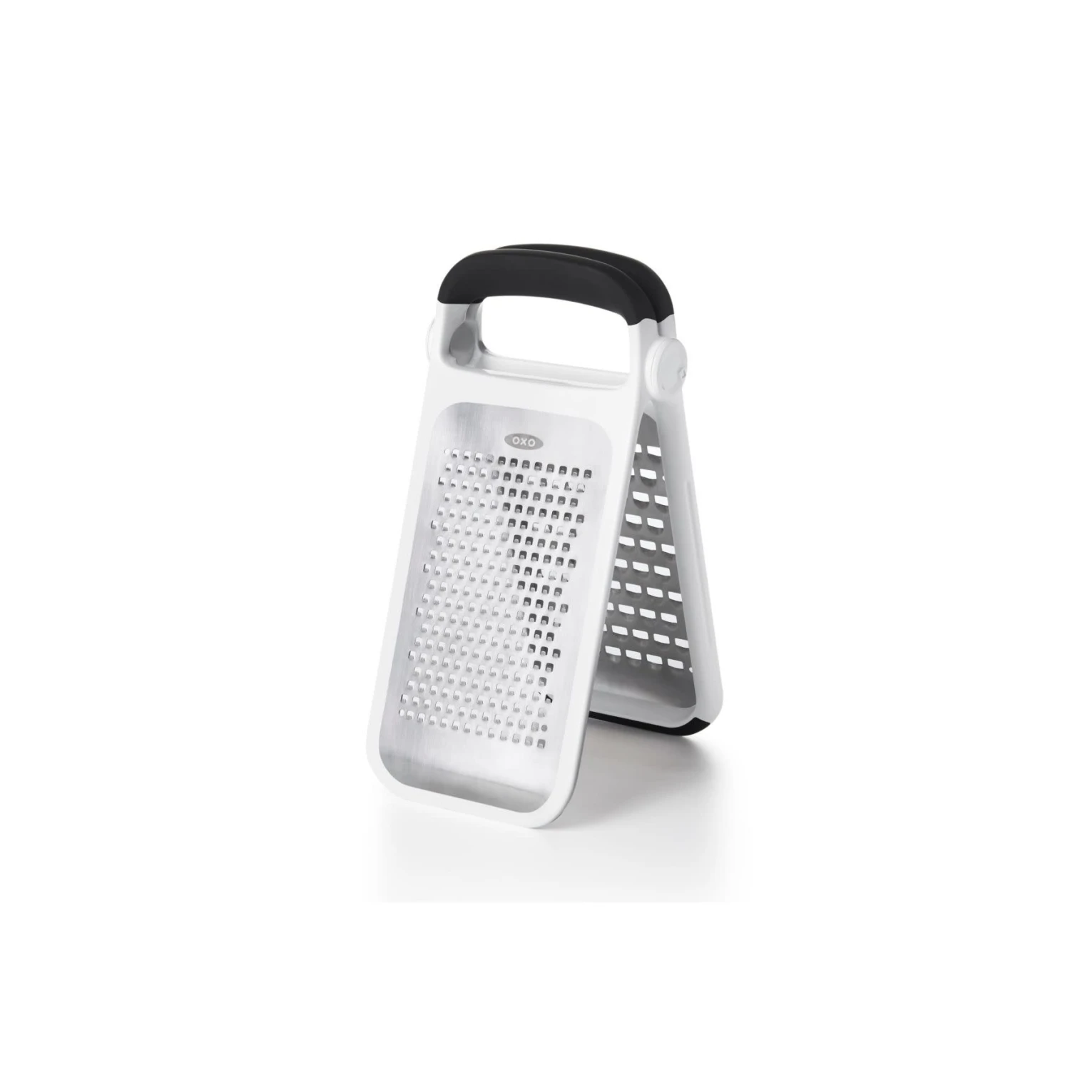 The OXO Good Grips Etched Two-Fold Grater has extra-sharp, etched stainless steel grating surfaces that stand upright together over a cutting board or detach for use over a bowl.