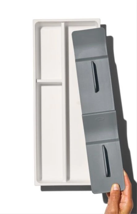 The OXO Good Grips Compact Utensil Drawer Organizer is perfect for kitchens with tight, shallow drawers. Our Organizer is divided into sections that ensure your utensils stay stacked to save space. The non-slip feet keep the Organizer in place when you open and close the drawer. The space-maximizing design features square corners to eliminate gaps and deliver a clean, custom look in your drawers. The tray is removable for thorough cleaning and for ease when setting the table.
