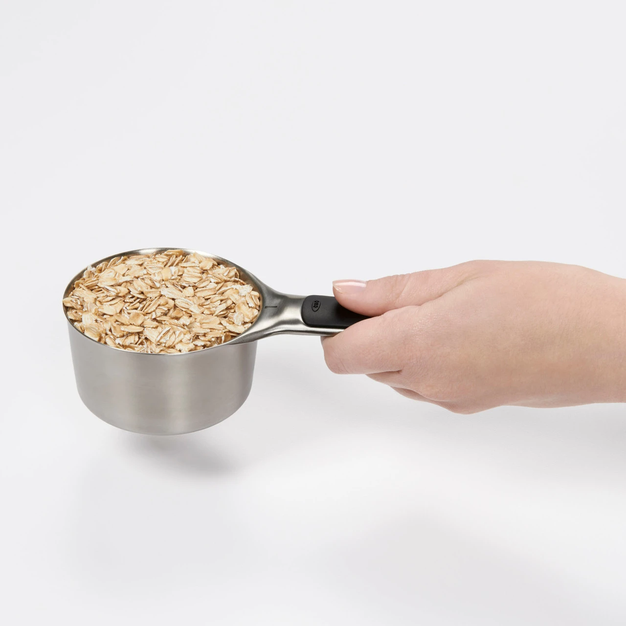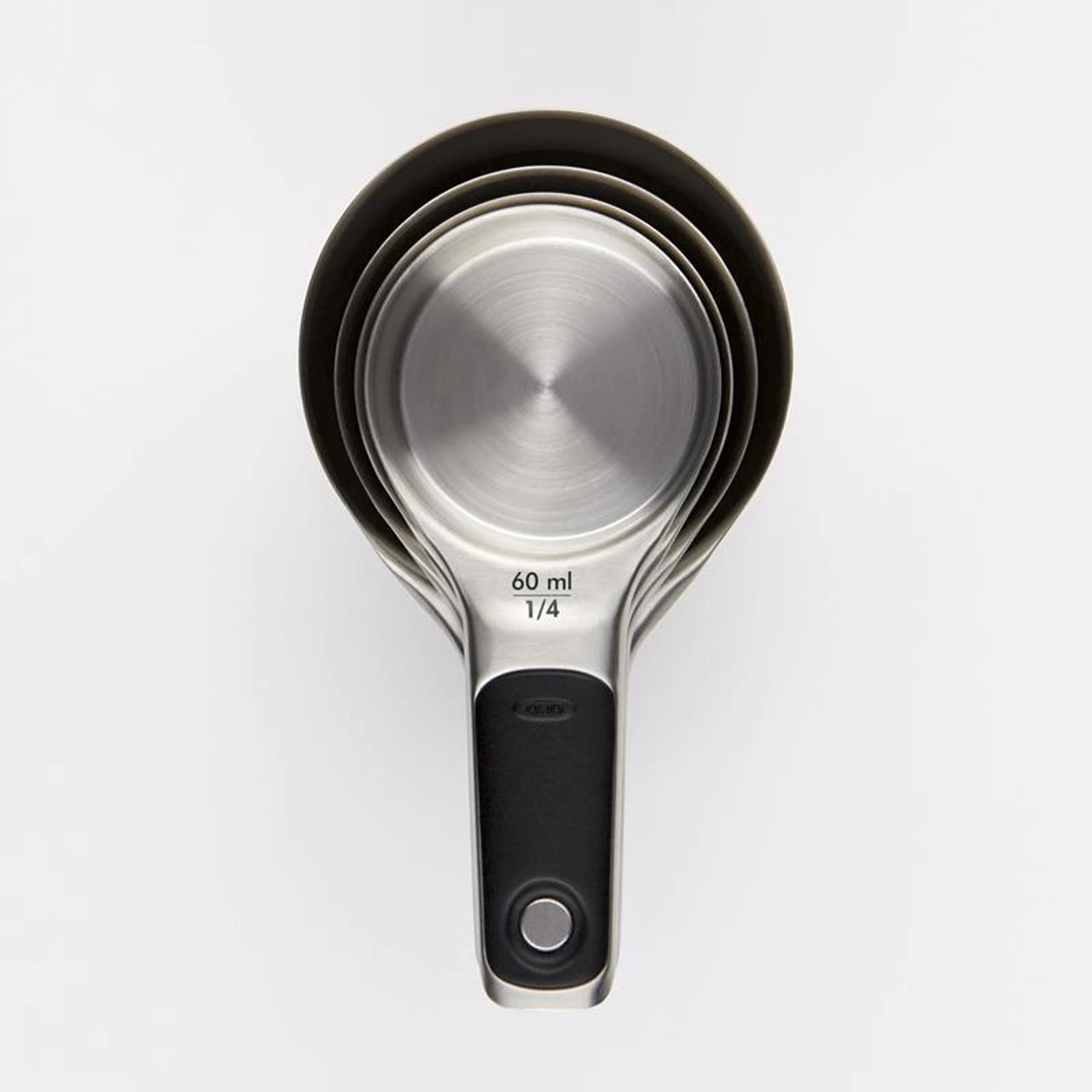 The OXO Good Grips Stainless Steel Measuring Cup Set is an elegant yet functional measuring solution. The unique magnetic feature allows you to easily remove one Cup at a time. This feature also keeps the Cups neatly stacked together for storage. The sturdy, Stainless Steel Measuring Cups are designed to make leveling ingredients easy for greater accuracy. The Cups feature permanent, etched measurement markings and have soft, comfortable, non-slip handles. Set includes 1/4 Cup, 1/3 Cup, 1/2 Cup and 1 Cup Measuring Cups.