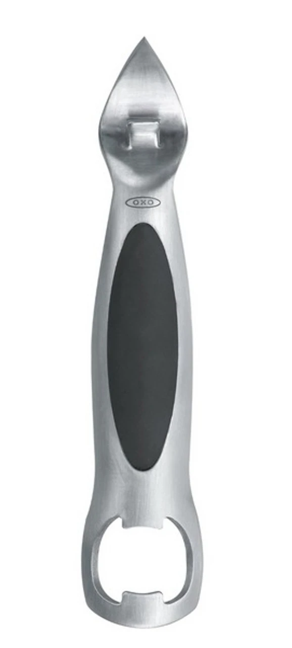 This easy to use bottle opener from Oxo Steel has a durable brushed stainless steel construction. The bottle opener allows you to easily open bottles and includes a can puncher to punch holes into cans. The bottle opener features a soft grip for added comfort and is dishwasher safe.