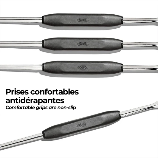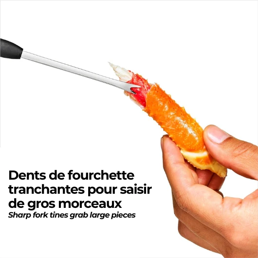 The OXO Good Grips Seafood Picks are shaped to get meat out of legs or claws. With a curved spoon head and long neck, the Picks reach deep inside shells. The opposite side has sharp fork tines for grabbing large pieces of meat. Featuring a soft, comfortable grip, these Picks are non-slip even in wet hands. Also great for getting olives and pickles out of jars.