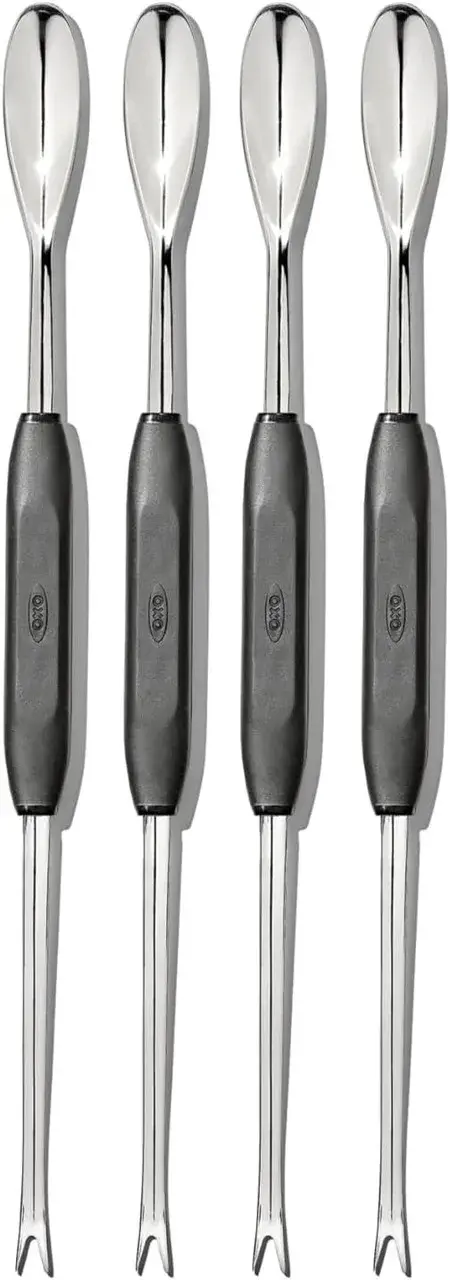 The OXO Good Grips Seafood Picks are shaped to get meat out of legs or claws. With a curved spoon head and long neck, the Picks reach deep inside shells.