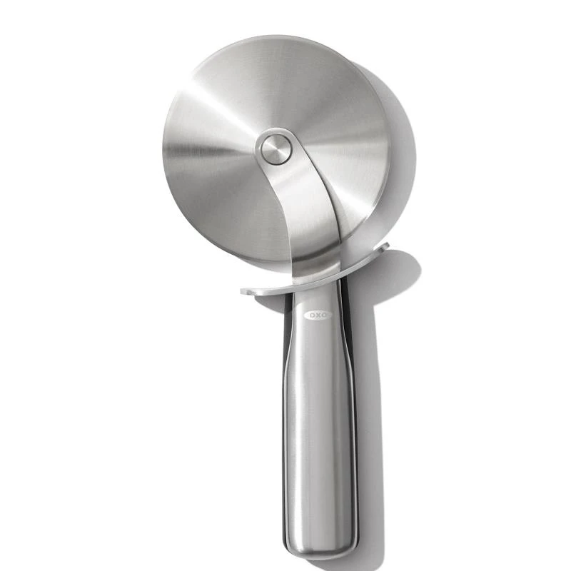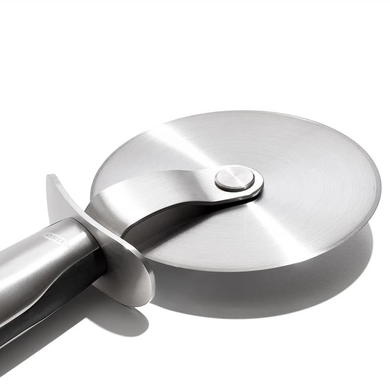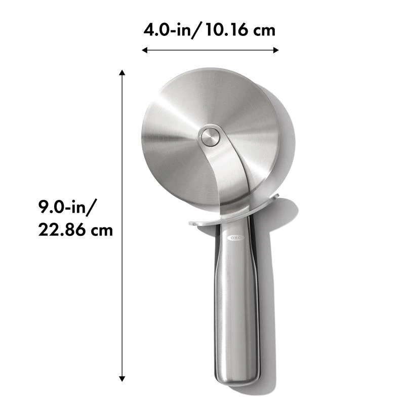 - Sharp, stainless steel blade cuts through thick or thin crusts.