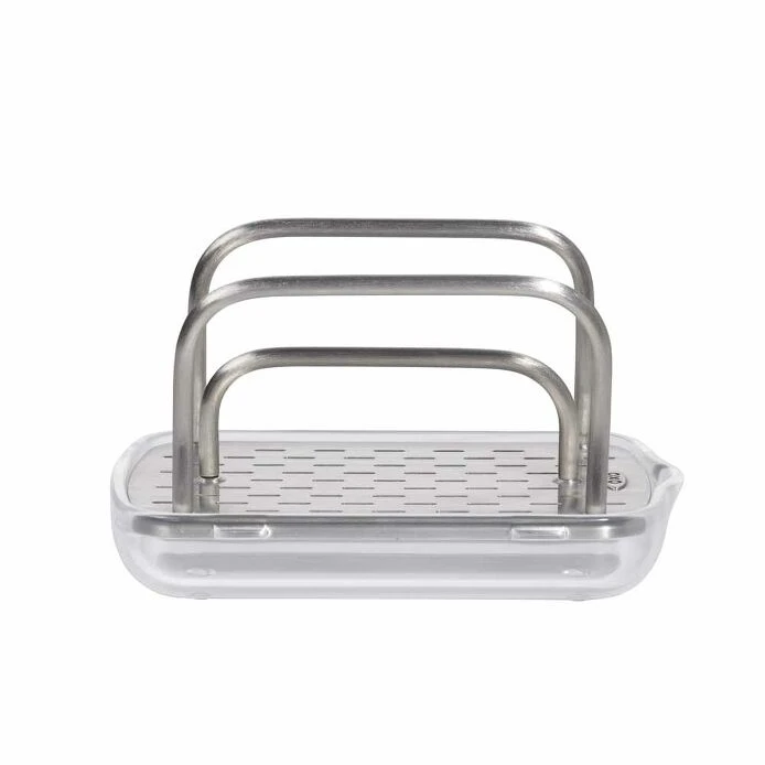 The Stainless Steel Sponge Holder keeps two sponges or scrubs at the ready for washing dishes. Compact design allows it to fit neatly next to the sink without taking up much space. The drip tray is removable for easy cleaning. Open sides and ventilation holes allow for maximum aeration, and the pour spout allows for draining soapy water.